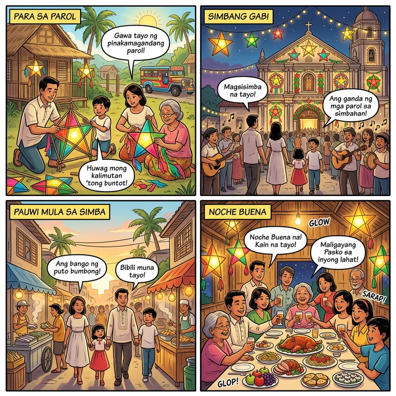 A vibrant and engaging comic strip about a traditional Christmas Eve in the Philippines. The comic panels should capture key moments: the preparation and hanging of parols (star-shaped lanterns), the simbang gabi (night mass), and the noche buena (a sumptuous midnight feast). Various Filipino characters—kids, adults, the elderly—participating in these activities should be included. Be sure to depict a diverse range of people in terms of age and gender, making the scene inclusive and representative. And also, include unmistakable signs that the setting is in the Philippines: jeepneys, bahay kubo (hut), Filipiniana clothes, and tropical environment.