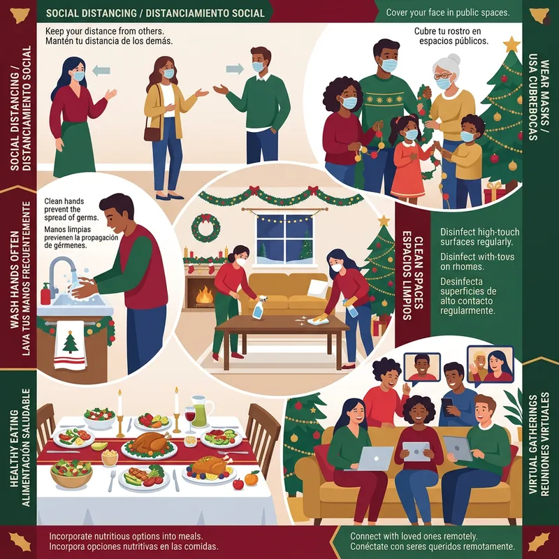 Vector graphic illustrating different precautions during Christmas. Depicts diverse individuals practicing social distancing, washing hands, and wearing masks. Additionally, shows well-cleaned spaces with Christmas decorations, healthy food at the dinner table, and people smiling while using digital devices for virtual gatherings. The image also includes, on the periphery, short bilingual text explanations in English and Spanish.