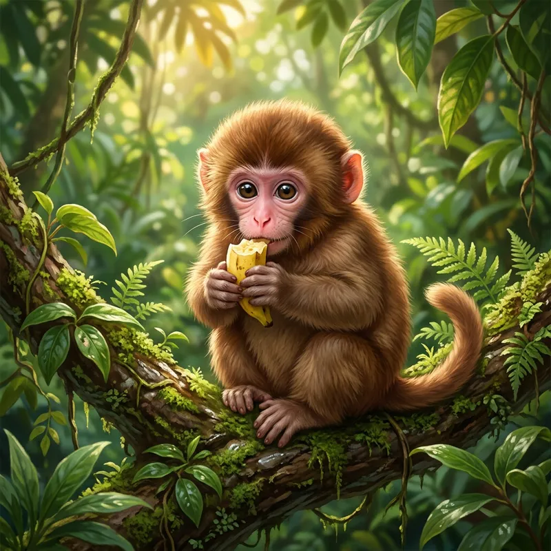 Create a realistic illustration of a chubby baby monkey. This adorable creature has brown fur and a tiny pink face, highlighting its bright, curious eyes. The baby monkey is sitting comfortably on a lush green tree branch in a tropical rainforest, holding a small piece of ripe banana in its tiny hands. The sunlight dapples through the forest canopy, casting a soft, warm glow on this playful scene.