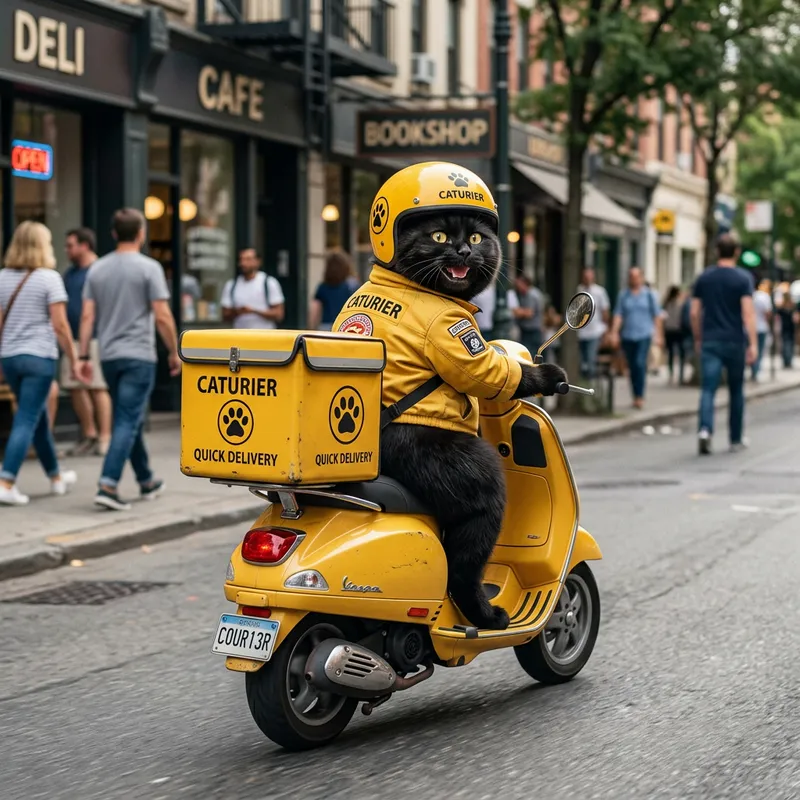 A chubby, adorable black cat that appears to have popped-out of a cartoon, now in real life. The cat, dressed in a courier's yellow uniform, is sitting on a yellow moped and driving on the street. People are walking on the sidewalk in the background. He carries a square yellow backpack behind him. In this high-resolution, professionally shot, aesthetic, beautiful, and realistic image, the cheerful cat is seen smiling from the rear view. Note that this image should be created with a hyper-realistic and photo-realistic touch, giving crisp detailing to the character and environment, devoid of any specific studio style or influence.