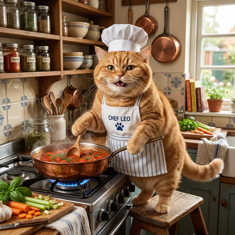 A cartoon-like cat brought to life. It's a chubby, ginger, British breed cat. It's wearing a chef's bib and hat. The cat finds itself in its own kitchen and he's cooking something at the stove. He's in a great mood, displaying a broad smile. The scene should embrace realism, hyperrealism, and photorealism. Aim for a professional look, high resolution and detailed, making it aesthetically pleasing and appealing.