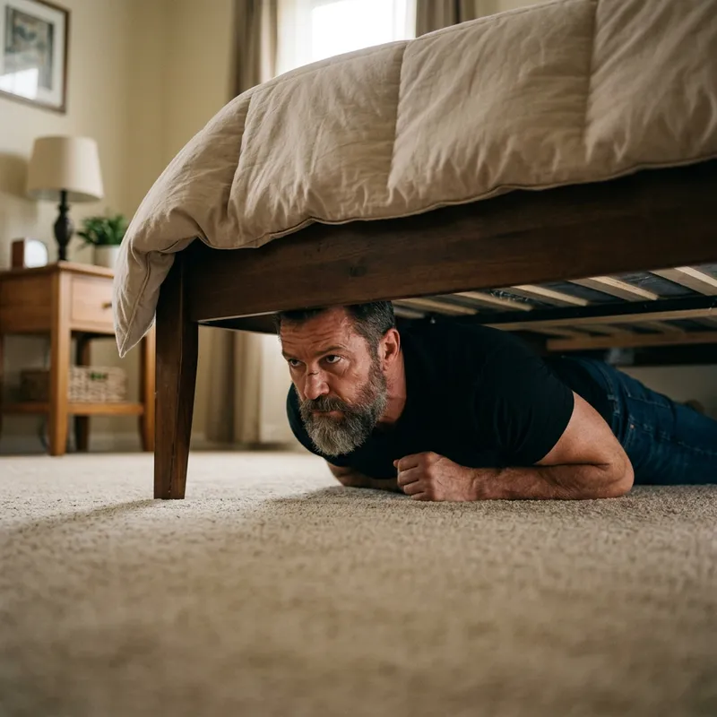 A muscular middle-aged man with a beard, resembling a famous martial artist, is humorously hiding under a bed. He is lying on his stomach and his head peeks out from the edge, his eyes scanning the room with a determined look. The dim lighting under the bed casts shadows across his face, enhancing his rugged features. The man's attire consists of a black, fitted t-shirt and blue jeans. The underside of the bed is simple and wooden, the comforter above is a soft, inviting beige. The surrounding room is carpeted with beige and carries a cozy, homely feel.