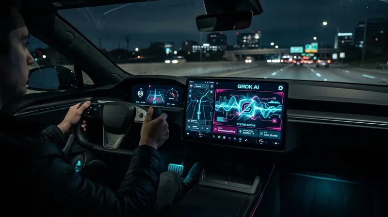 Cinematic interior of a Tesla car at night. The central dashboard screen displays a glowing 'Grok' AI interface with electric cyan #00D4FF pulse lines and magenta #FF006E accents. Futuristic, minimalist UI, high-tech automotive interior. Dark background #0D1117. Wide angle view.