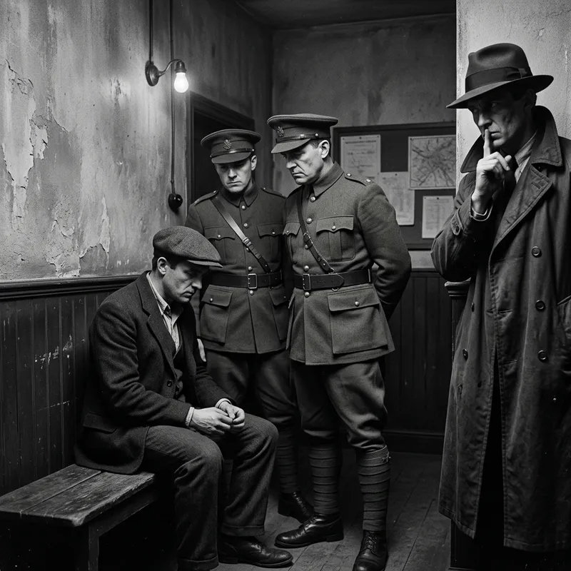 Two stern men in old style military uniforms are standing over a man, while a tall figure in the side observes the scene with a severe expression, putting a finger to his lips, signaling for quiet. An era of circa-1920s atmosphere fills the room.