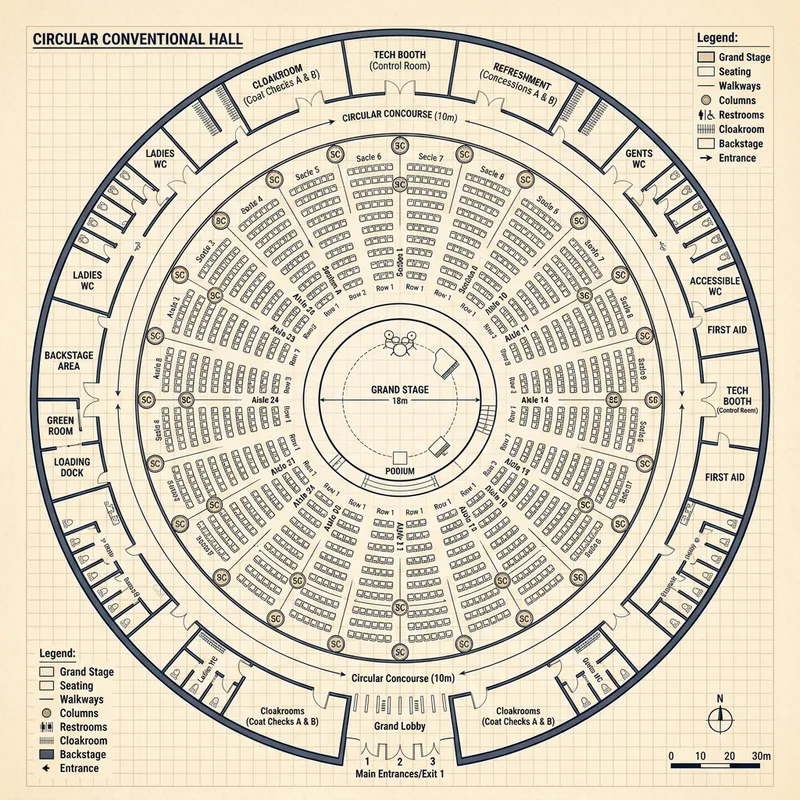 Design of a circular floor plan for a conventional hall. The hall consists of a centralized stage surrounded by multiple chairs arranged in a radial pattern from the center. In the middle of the hall, a grand stage can be seen, designed for various performances. The boundaries of the hall are lined with doors leading to auxiliary spaces like restrooms and cloakrooms. There are a few columns tastefully embedded within the seating to support the structure. Visible are also the designated walkways to aid in navigation around the hall. The ambiance is warm and welcoming.