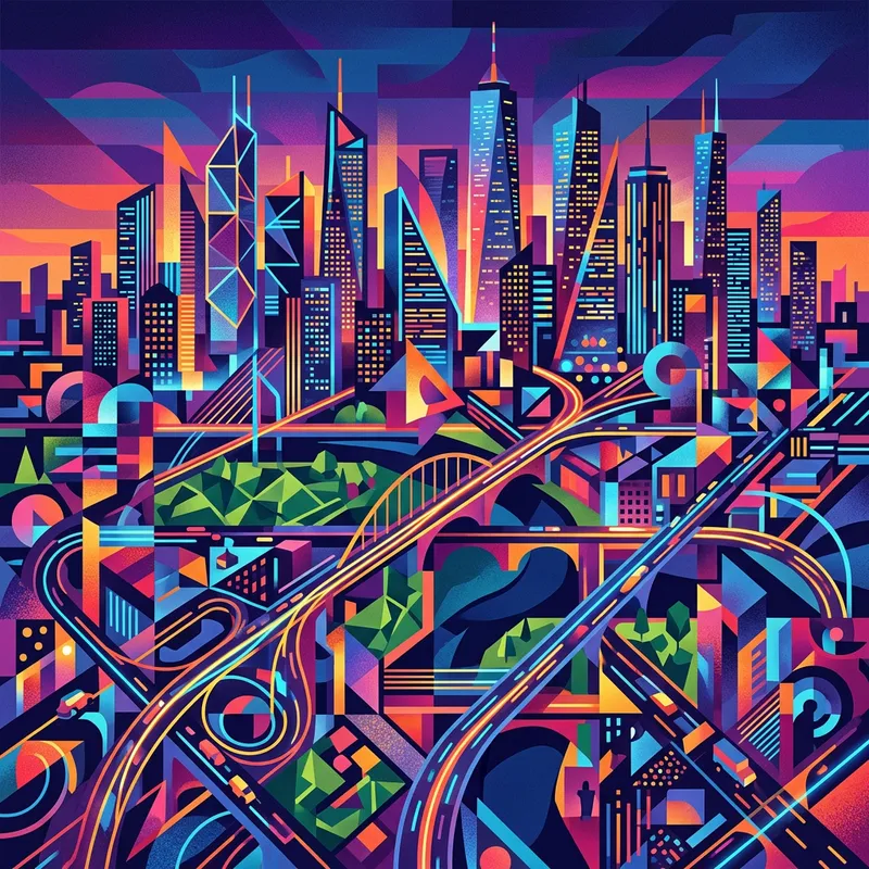 An abstract representation of a cityscape. Delineate the radiant skyline filled with towering skyscrapers, symbols of modernity. Fill the frame with geometric representations of urban features like roads, bridges, and city parks, with a playful juxtaposition of random shapes and lines against structured elements reminiscent of a city grid. Let the color palette be vivid and diverse; saturated hues to mimic vibrant city lights against the dusky palette of twilight. The result should be a highly stylized work, conveying the chaos, elegance, and energy of vital city life.