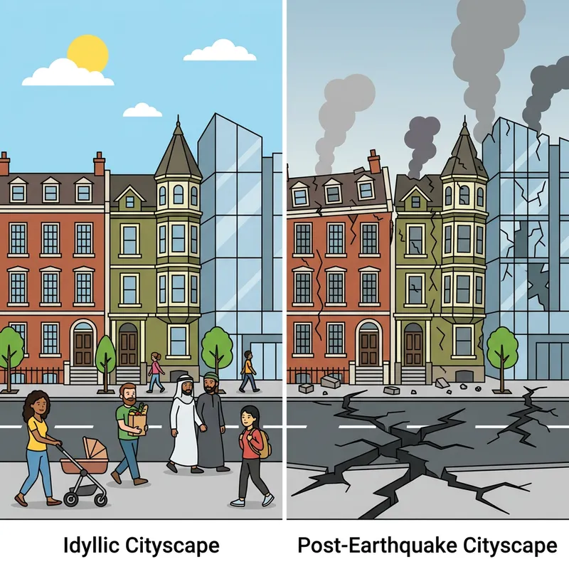Cityscape Evolution: Idyllic Vs Post Earthquake Scenes