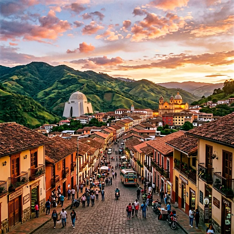 A view of Ciudad Alfaro in Montecristi, Ecuador. The city is nestled in the green rolling hills, with building facades displaying a variety of warm tones. The streets are bustling with local people of diverse genders and descents, engaged in their daily lives. The orange-hued sunset casting a gentle glow over the cityscape, creating a picturesque sight. Antique colonial-style architecture can be seen, displaying intricately designed doors and windows. The sky above is a vibrant mix of warm hues, with cotton candy clouds lightly scattered.