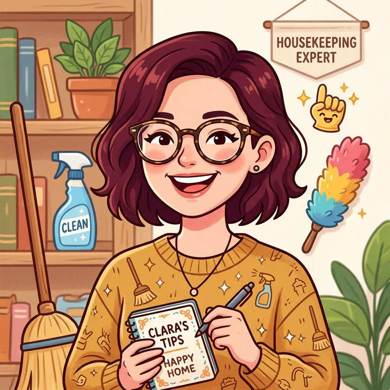A cartoon style profile picture of Clara, an enthusiastic blogger who is an expert in housekeeping and shares precious tips on this topic. She has a radiant smile expressing both her joy and dedication to helping others improve their housekeeping skills. Her appearance reflects her passion for blogging, featuring trendy glasses and a casual yet stylish outfit. The background may include symbols or objects related to housekeeping such as a feather duster, a broom, or a smiley face wearing a cleaning glove to symbolize her joyful approach to cleaning.
