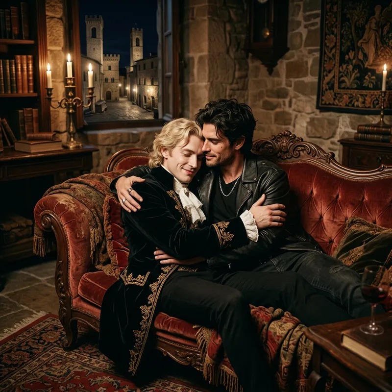 A scene where a blonde male vampire, reminiscent of characters from classic vampire novels, and a brunette male vampire that echoes elements of modern vampire series, are hugging each other in a moment of camaraderie. They are lying on an antique sofa, nestled comfortably in a room that brings the essence of an ancient Italian city, Volterra. Their costumes are indicative of their vampiric nature, and their expressions leave an aura of the mysterious vampiric world.