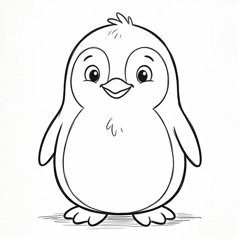 An easy and amusing depiction of a cartoon penguin, designed to be suitable for coloring by a 3-year-old child. Its style should resemble that of classic children's book illustrations from the 19th century, keeping it simple and child-friendly without any colors. The penguin should be sketched with gentle and smooth lines, and devoid of any complex details or backgrounds, making it a perfect coloring page for a beginner.