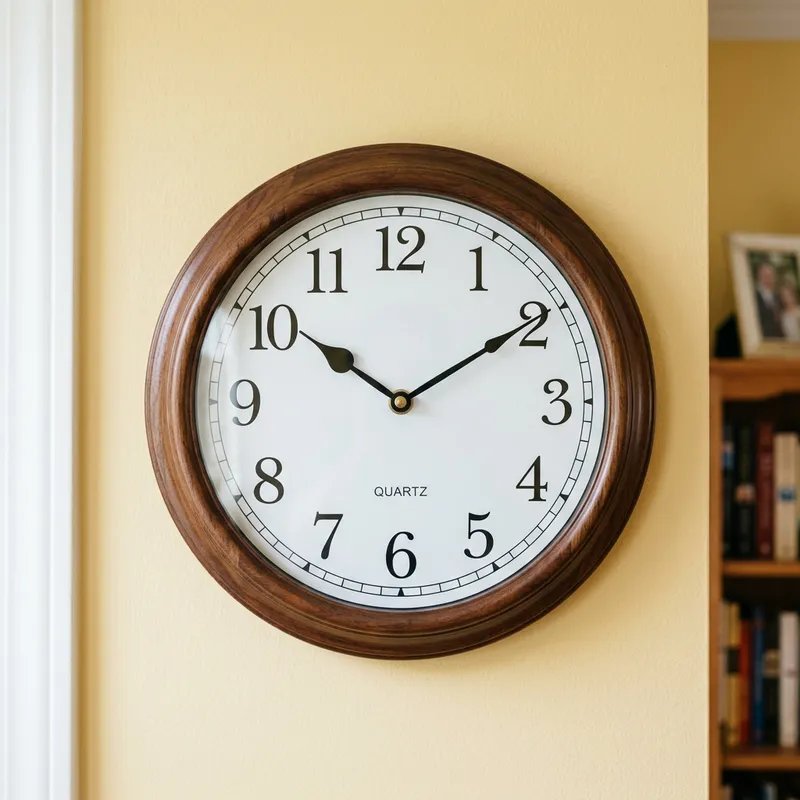 A classic round wall clock with a white face, black numerical markers, and two hands - one for hours and the other for minutes. The casing of the clock is made out of dark brown wood, giving it a sleek yet traditional appeal. It hangs on a pastel yellow wall, casting a small shadow beneath it.