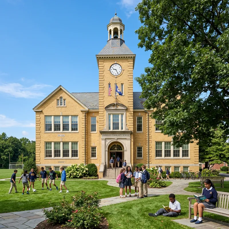Classic School Building with Diverse Student Activities