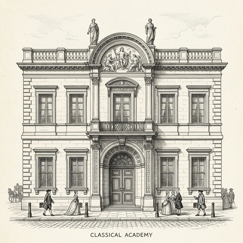 Create a black and white pencil drawing of a classical-style 2-story building. The facade is symmetrical, with the second story slightly shorter than the first. The ground floor features a large, central arched entrance with a double door, flanked by two rectangular windows on each side. An intricate decorative arch and a keystone reside above the entrance. The second story has five rectangular windows, the central one being larger. Above the central window is a bas-relief sculpture depicting a classical scene in an arched recess. The flat roofline has a balustrade and a central pediment which houses the bas-relief, and on either side of the pediment are statues. The light facade contrasts with the slightly darker architectural details. In front of the building, there are a few figures in period clothing, showcasing the grandeur of the architecture. The background is a plain sky and the foreground is a simple street or pavement.