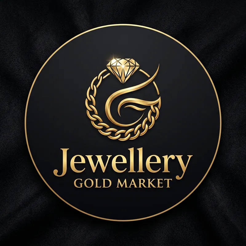 Create a logo for an application named 'Jewellery Gold Market'. The logo should have a classy look reflecting the aesthetic of fine jewelry, and incorporate hints of gold hues. Perhaps it could include a stylized, elegant font for the text 'Jewellery Gold Market', intertwined with a luxurious gold chain or a diamond. The backdrop might be a richly textured black, to highlight and contrast the gold elements. The style should be clean and modern to give a feeling of easy navigation, a prominent feature of application logos. Remember to keep it simple enough to be recognized even at small sizes.
