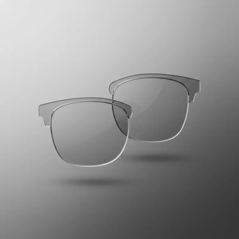 An image illustrating two floating browline lenses with no frames set against a gradient background. The color scheme for the image should only include shades of gray, black, and white. The scene is kept free of any additional objects making it ideal for use as a clean, minimalist website banner.