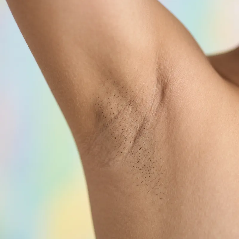 Detailed view of a clean, well-groomed underarm area of an adult human, showing natural skin texture and a small amount of neatly trimmed hair. The skin tone is a universally neutral tone, representing no specific race or ethnicity. The background is a soft, blurred gradient of pastel colors.