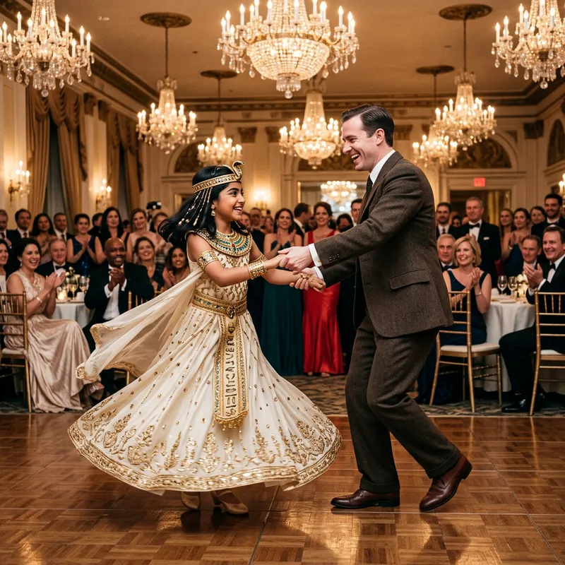 A young Middle-Eastern girl is dressed as an ancient Egyptian queen, complete with a regal Cleopatra costume. Across from her is a Caucasian man, donned in an early 20th-century jacket and trousers, minus any political symbols. They are positioned in mid-twirl, captured in the elegant rhythm of the foxtrot dance, their eyes locked and smiles bright. The dance floor under them catches the light of the chandeliers that dangle from above, illuminating the fancy dresses and suits in the audience.