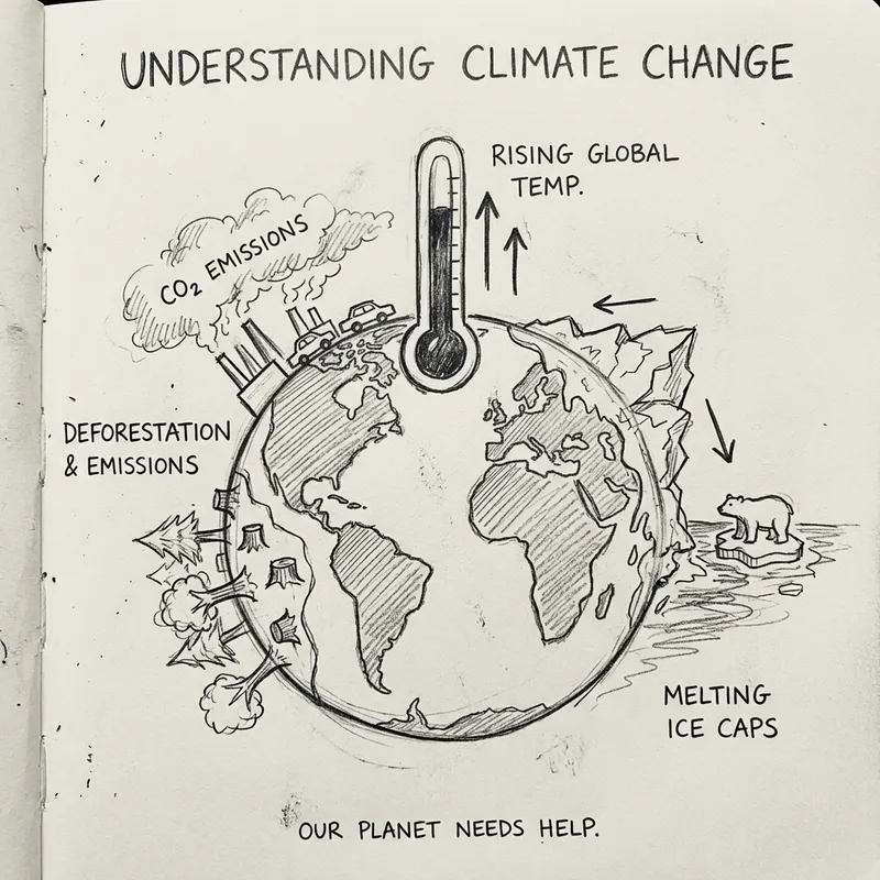 Create a simple sketch embodying the concept of climate change. The image should be presented in an amateur style, using pencil and paper. Include elements like the earth, a thermometer indicating rising temperatures, melting ice caps, and deforested areas. Despite the basic style, strive to capture the serious and pressing nature of the global issue.