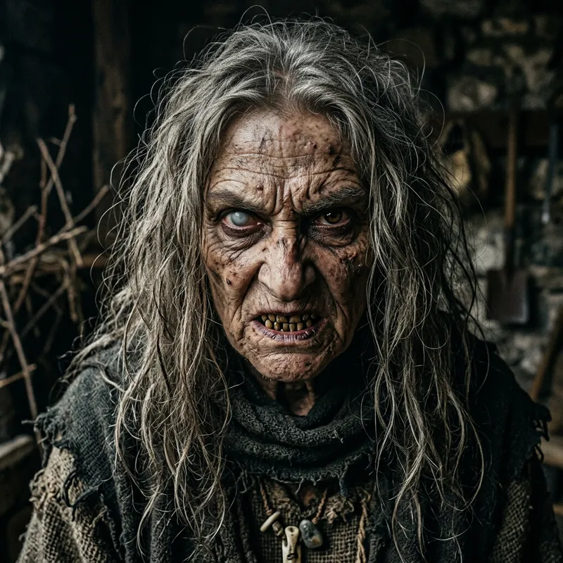 Close-up of a scary witchy person with long hair, inspired by Bernie Wrightson, Grandma Weatherwax, Evil Dead.