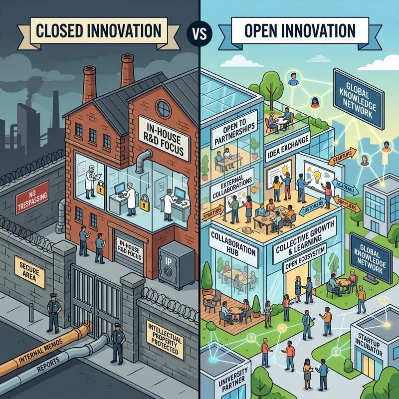 Generate an image that aptitidunally illustrates 'Closed Innovation' versus 'Open Innovation'. For 'Closed Innovation', depict a traditional company structure with high barriers, limited communication channels, strong protection of intellectual property, and a focus on in-house research and development. Now transition to the 'Open Innovation' scene, where present a modern company with porous boundaries, extensive external collaborations, sharing of ideas, and a focus on collective growth and learning. Ensure that the two contrasting environments are clearly defined and easily distinguishable.