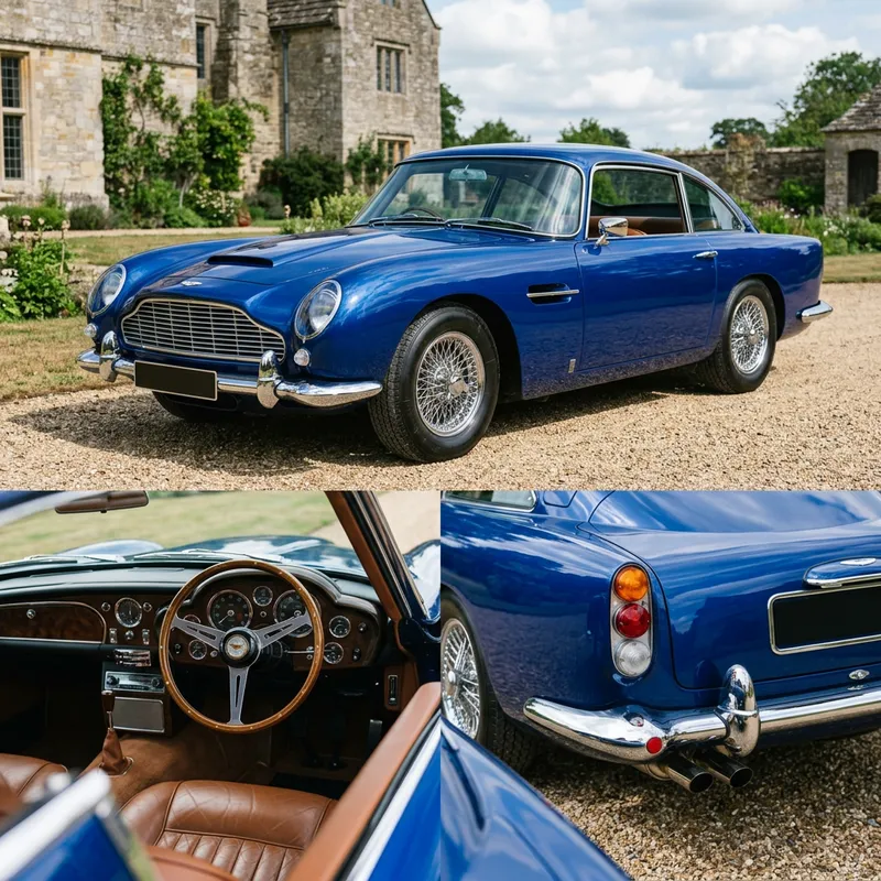 Los detalles de un coche clásico, brillante y bien mantenido, con colores vibrantes y superficies relucientes. La pintura es de un tono azul cobalto profundo que contrasta con las llantas cromadas. La silueta del coche tiene fosas nasales delanteras graciosamente esculpidas y luces traseras circulares. En su interior, los asientos de cuero marrón pulido exudan elegancia y refinamiento. Hay un volante de madera con incrustaciones de nácar, y el tablero de instrumentos brilla con indicadores cuidadosamente diseñados y acabados pulidos. En la parte trasera, un sistema de escape doble perfectamente simétrico finaliza la visión general imponente del coche.