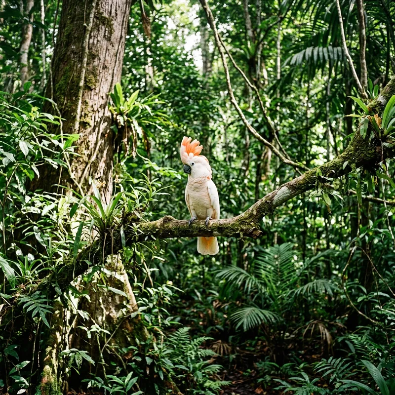 A dense rainforest on the island of Borneo, with the spotlight on a Cockatoo. The bird is perched on an extended branch of an old, towering tree, full of lush green leaves. Verdant undergrowth plants cover the rainforest floor. The pale sunlight seeps through the thick foliage, creating a mottled pattern of light and shadow on the forest floor. Various sounds from unseen wildlife echo in the background, complimenting the tranquil setting.