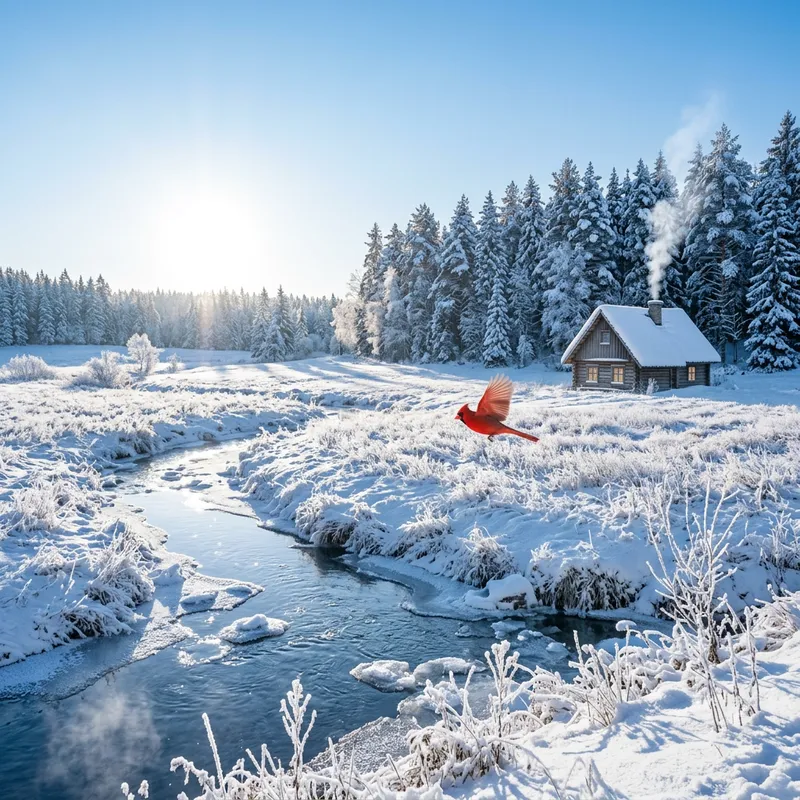 A serene landscape where the frost has gently coated the ground. The sky is a clear, icy blue with a low hanging, brilliant white sun casting long shadows. Faint wisps of breath can be seen in the crisp air. A snow-laden pine forest stands at the horizon and a crystalline creek meanders through the foreground, chunks of ice floating in its steady current. The stillness is momentarily broken by a red cardinal smoothly jetting across the expanse, its vibrant color in stark contrast with the surrounding whiteness. A small snow-covered cottage sits cosily tucked away at the edge of the forest, smoke rising from its chimney.