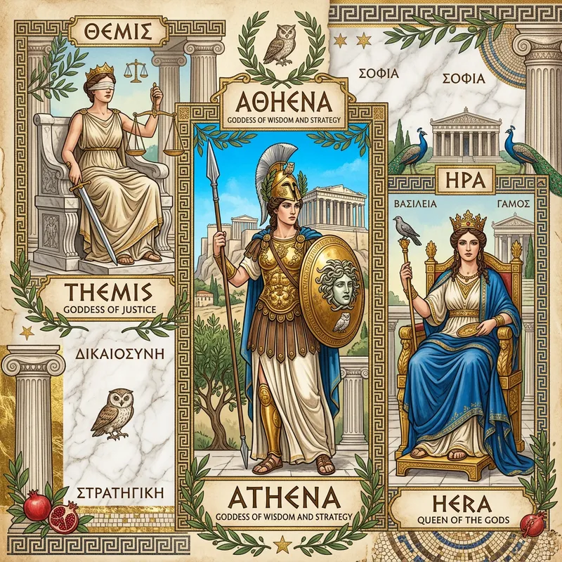 Collage of Greek Goddesses: Themis, Athena, and Hera