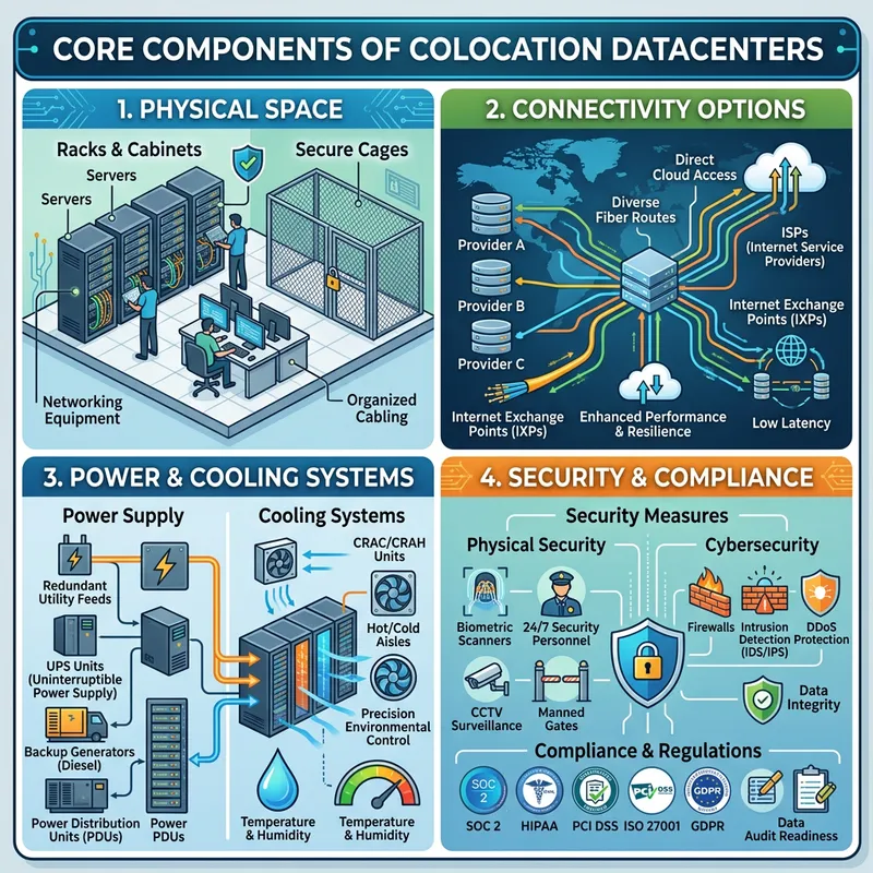 Imagine an informational graphic that highlights the core components of colocation. The graphic should divide into four key sections. The first section displays different types of physical space found in colocation facilities, such as racks, cabinets, and cages, housing servers and networking equipment. The second area illustrates connectivity options, demonstrating access to various ISPs and internet exchange points, enhancing network performance and resilience. The third segment explores the power supply and cooling systems, essential for maintaining optimal operating conditions for the equipment. Finally, the fourth area discusses the physical and cybersecurity measures in place and compliance with industry standards and regulations, representing the safety and integrity of clients' data.