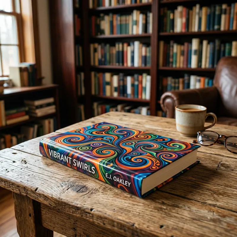 Visualize a closed hardcover book with a glossy dust jacket. The cover of the book features an abstract design comprised of intertwining swirls and spirals in a spectrum of vibrant colors. The book is set on a rustic wooden table, with the patterns and grains of the wood visible. Light from a nearby window casts soft shadows, adding depth and dimension to the scene. In the background, we can see an array of blurred out elements indicative of a cozy, book-filled study, such as a tall, mahogany bookshelf filled with a plethora of other interesting and variously sized books.