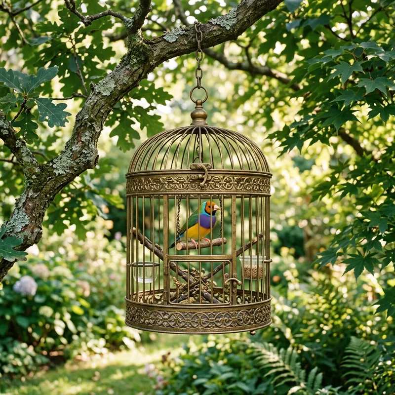 Serene Captivity: Colorful Bird in Antique Cage