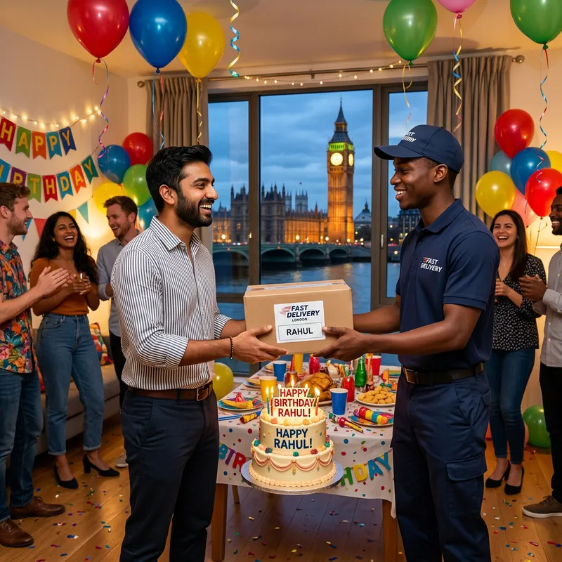 A lively birthday room decorated with colorful balloons, streamers, and a large cake on a table. A courier, wearing a uniform and carrying a package, is handing over the present to a South Asian man who is beaming with joy. Through the room's window, we can see the iconic London landmark, Big Ben, standing tall against the dusky evening sky.