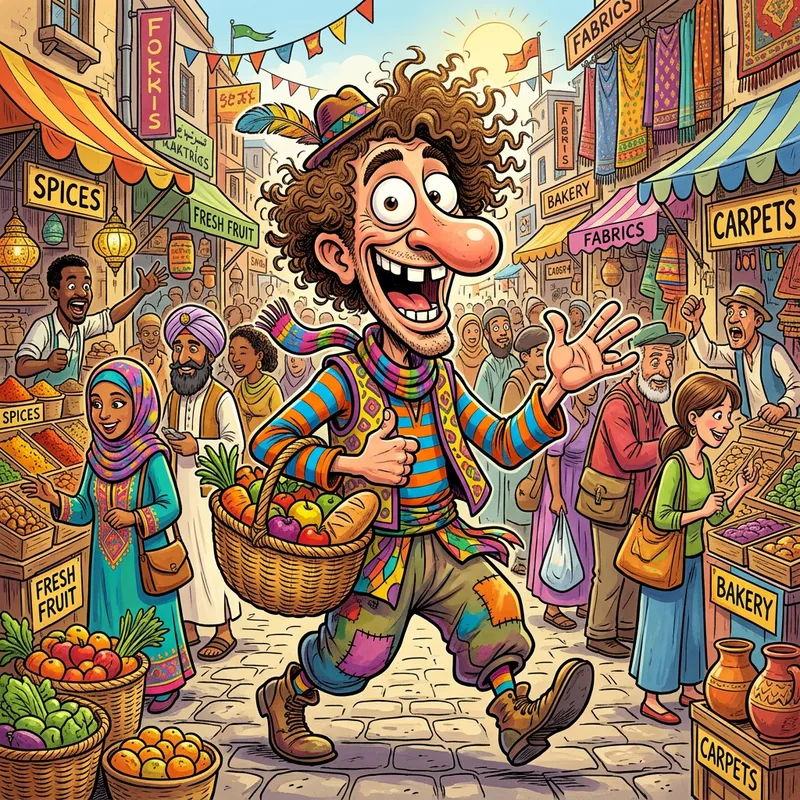 A humorous illustration of an exaggerated cartoon character with large eyes, an oversized nose, and a wide grin, wearing vibrant, colorful clothes. The caricature has curly hair and seems to be situated in a bustling market, filled with stalls selling a variety of wares, and people of diverse ethnicities and genders in the background.