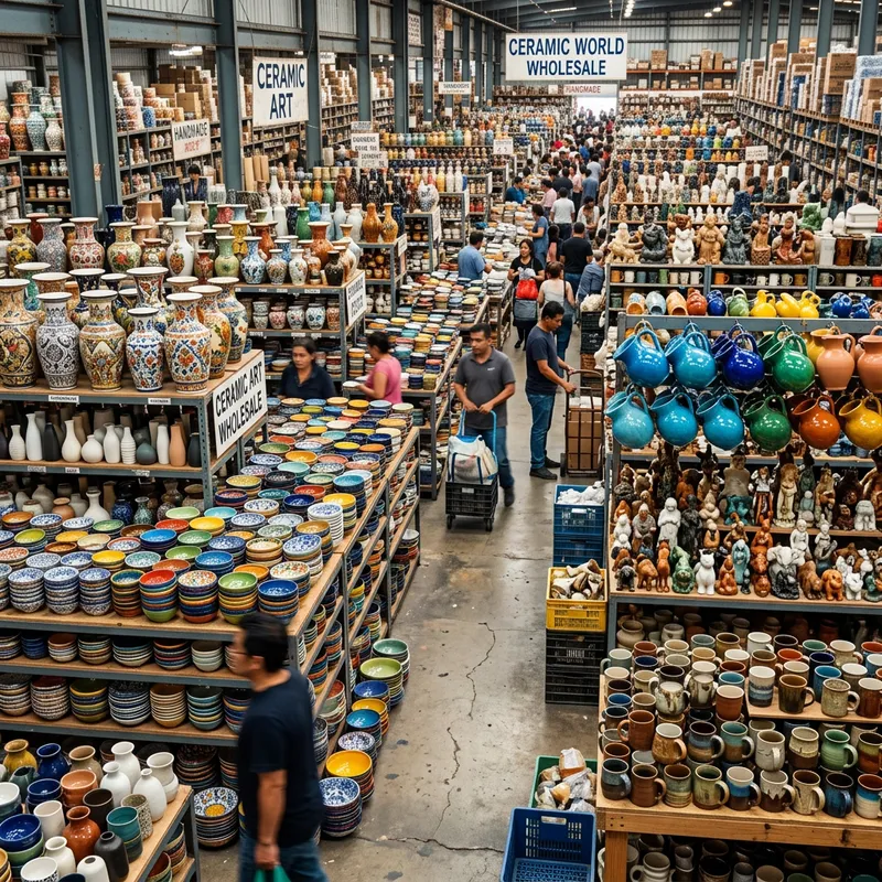 Imagine a large wholesale market filled with an array of ceramic products. The space is abundant with vibrantly colored bowls and plates stacked neatly on shelves. There are ornate vases of various sizes, some decorated with intricate designs and others showcasing minimalistic beauty. Ceramic pitchers with gloss finishes catch the light, causing them to gleam. Statuettes and miniature figurines occupy a separate section, exhibiting creativity and craftsmanship. Stoneware mugs sit in clusters, differing in shapes and colors, reflecting the diverse style of the ceramic art. The whole scene conveys the bustling energy of a ceramic wholesale market.