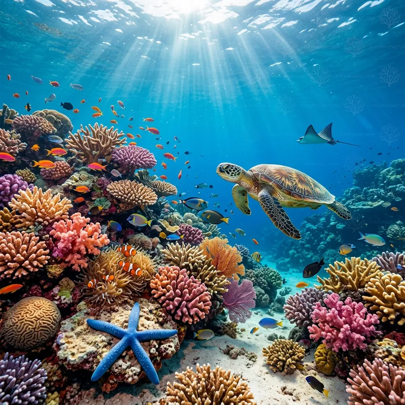 Visualize a breathtaking underwater landscape displaying a vividly colored coral reef with a variety of marine life, such as fish, sea turtles, and starfish. Also, subtly implement a technique of digital watermarking into the scene, ensuring that it does not distract from the overall aesthetics of the underwater panorama.
