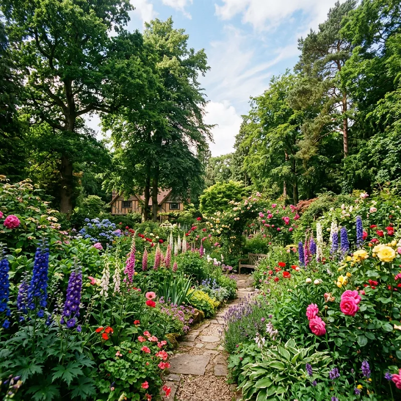 A flourishing garden, teeming with a wide range of plants exhibiting intense, lush colors alongside towering trees that appear to stretch towards the sky. This peaceful scene allows viewers to feel utterly engulfed in the ceaseless charm of nature.