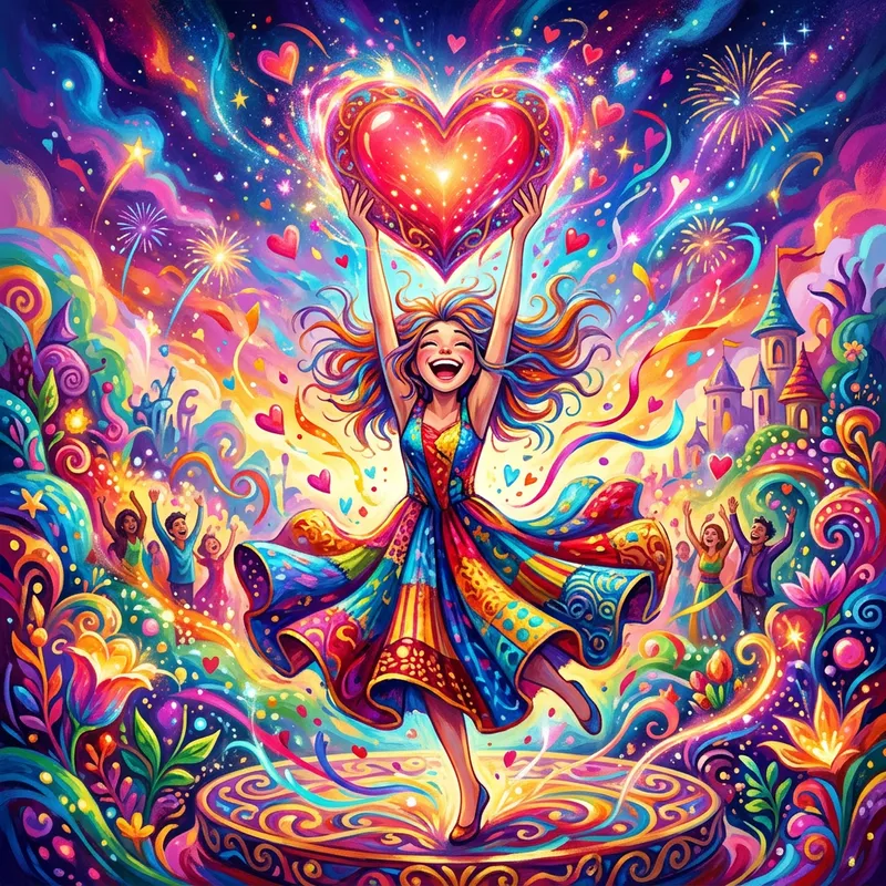 An image of a dramatically exaggerated depiction of a girl, who is raising a heart above her head. The girl has shoulder-length hair. All elements in the image are awash in vibrant colors.
