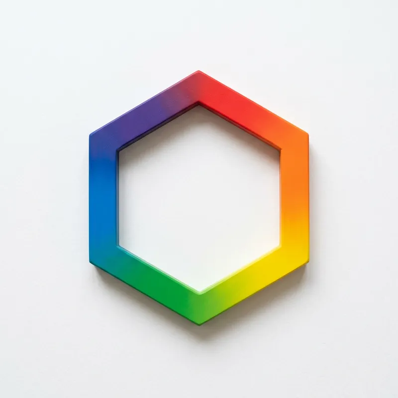 A six-sided geometric figure, known as a hexagon, with its sides painted in different shades of color. On a neutral white background, the figure is fully regular with all its angles and sides equally sized. Each side of the hexagon is painted with a distinctive color, making it vibrant and noticeable. The colors transition smoothly from one to another, creating a rainbow-like effect. To complete the scene, a soft shadow is cast to accentuate the hexagon's perfect symmetry and give it a three-dimensional look.