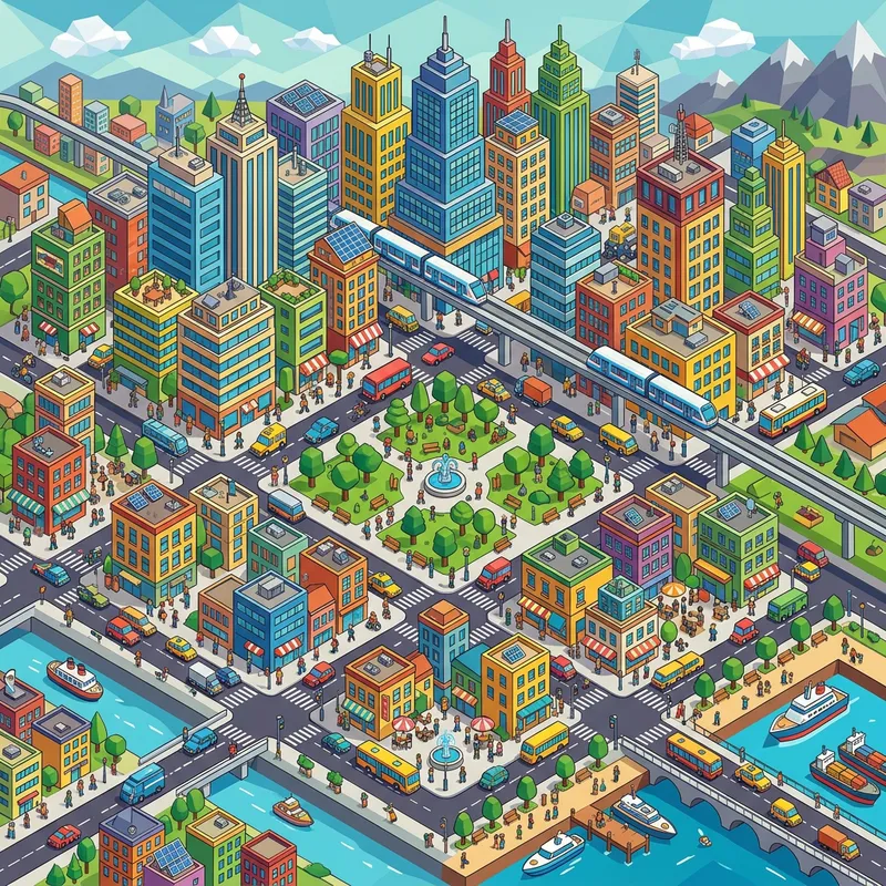 Colorful isometric cityscape with tiny buildings, vehicles, and people in a geometric 3D perspective.