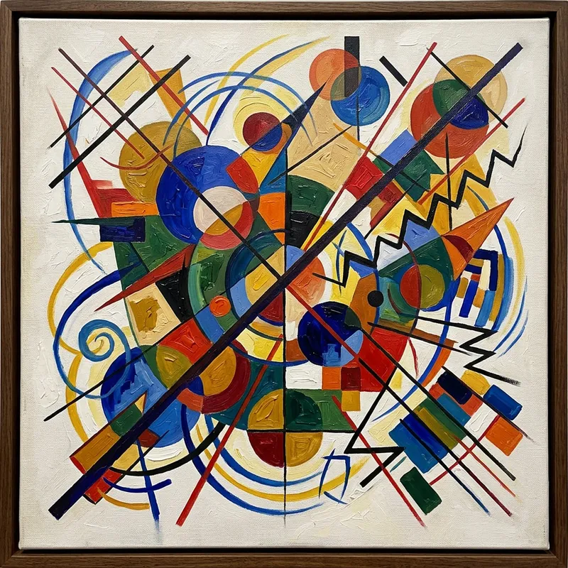 Create an abstract composition with intersecting, multicolored lines and geometric shapes, inspired by the early 20th century art movements. Think of colorful circles, triangles and rectangles, all interconnected with a variety of lines - straight, curved, zigzagged. These elements should reflect a dynamic arrangement, creating an illusion of movement within the image. Let the playing with colors and form suggest a kind of timeline, a history of events or emotions neatly ordered within the frame of the image. The primary medium is oil on canvas.