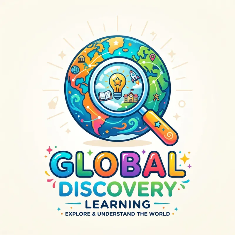 colorful logo design featuring a magnifying glass overlaid on a globe, in a playful and modern style, bold typography with fun elements, digital illustration with vibrant colors, engaging and educational theme