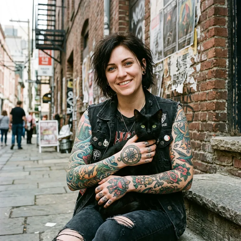 A Caucasian woman with oceanic blue eyes showcasing her colorful tattooed arms. She is seen in an urban setting with brick walls surrounding her, wearing a grungy style outfit in black. She gently holds a black cat with emerald green eyes, they seem to share an inseparable bond. The woman's tattoos tell a story of her journey, with every inked design representing a unique chapter of her life. The mysterious black cat, soft yet agile, shows a stark contrast with her vibrant tattoos but stands as a symbol of her strength and independence.