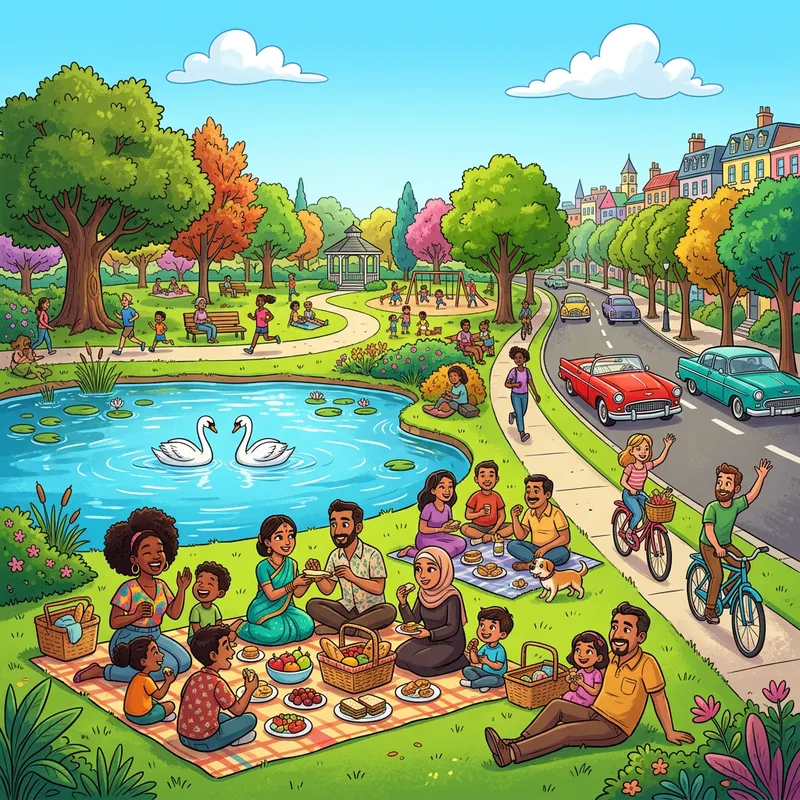 Turn the scene into a colorful and vibrant illustration that resembles the style often seen in animated cartoons. The scene consists of a peaceful park with lush green trees, swans swimming in a blue pond, families comprising of diverse ethnic backgrounds such as Caucasian, Middle Eastern, Hispanic, Black, South Asian and Asian enjoying the afternoon sun. Some of the park-goers have decided on a picnic, spreading a blanket on the grass and sampling various treats from baskets. Alongside is a street where a few vintage cars and people on bicycles are seen. The sky above is clear with tufts of clouds appearing now and then.