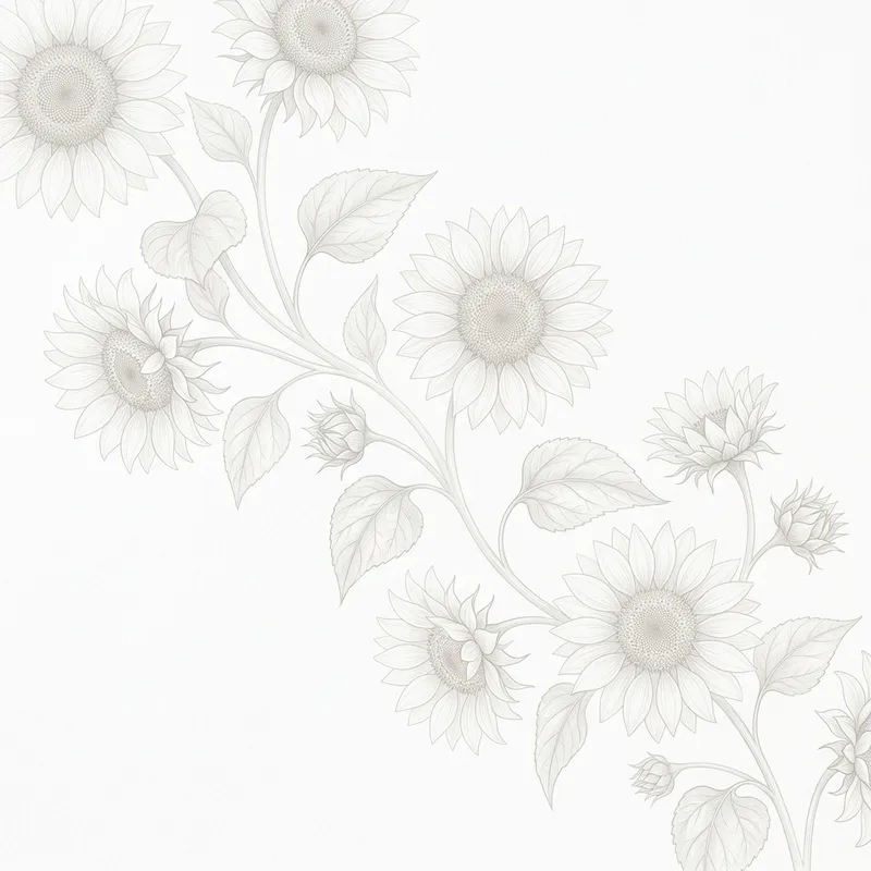 A transparent and colorless illustration of sunflowers arranged in a delicate pattern, subtly blended onto a crisp, white background. This photorealistic representation should exude a sense of calm and tranquility, with the sunflowers appearing like a gentle watermark. The image allows for a composition that prioritizes minimalism and simplicity, adding an air of sophistication and elegance to its overall aesthetic.