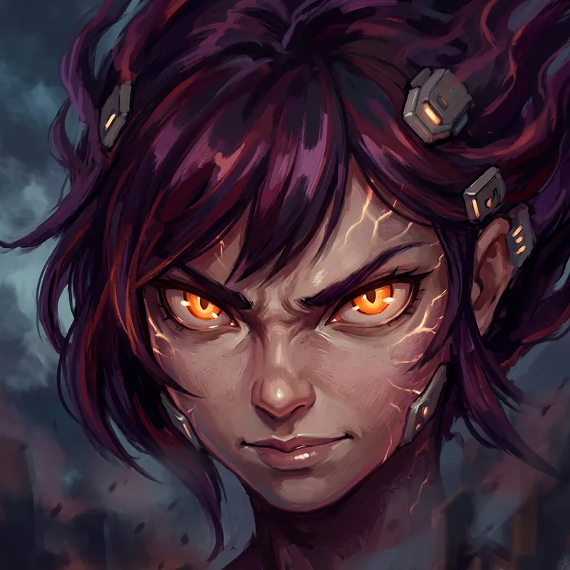 A towering colossal anime giant girl with a menacing expression, captured in an extreme close-up view. Her visual representation is drawn with dynamic linework and exaggerated facial features - highly significant of a kaiju-inspired design. Her depiction includes vibrant colors and is filled with a sense of immense power. The artistic rendering should reflect bold brushstrokes implying a digital painting medium. Please maintain a respectful representation throughout the composition.