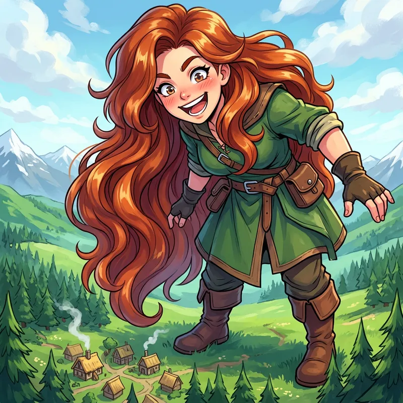A colossal giantess with vibrant auburn hair that hangs like a waterfall, inspired by anime aesthetics with striking colors and defined outlines. Capture her exaggerated facial expression which shows her vivacious and energetic nature. The art should resemble a digital painting with soft brush strokes. The palette should be energetic and brilliant, amplifying the anime-influenced theme.