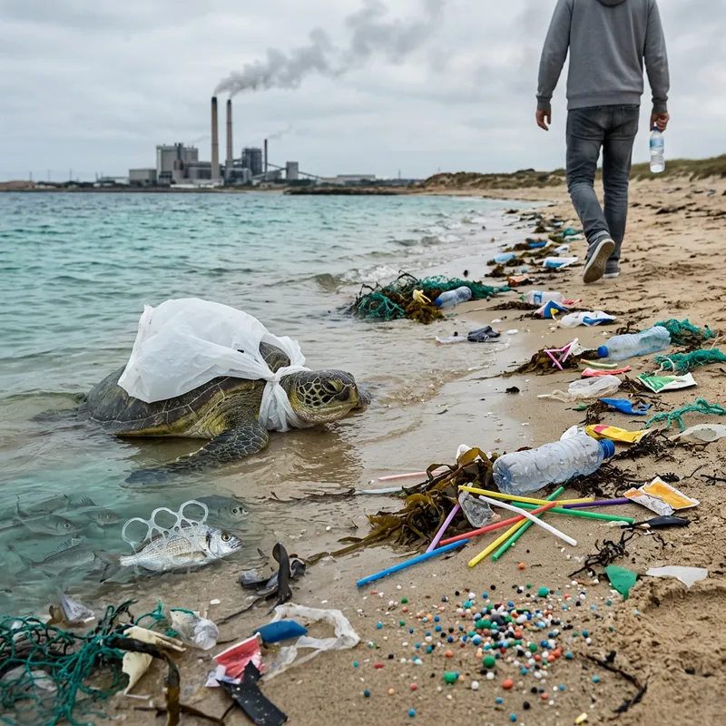 Create an image that illustrates the severity and negative impact of plastic waste on the environment and wildlife. The image should feature common elements of plastic pollution like plastic bags, bottles, straws, and minute plastic particles, known as microbeads. A marine turtle should be depicted as entangled within a plastic bag while a fish is wrapped in a plastic six-pack ring symbolizing the distress caused to the aquatic life. A person holding a plastic water bottle should be showcased, denoting how human consumption and wasteful habits exacerbate the issue of plastic pollution. Slightly distanced in the background, portray an industrial factory belching smoke and harmful pollutants, symbolizing the role of manufacturing in this crisis. The whole portrayal should emphasize the urgent requirement to combat plastic waste and explore sustainable alternatives to minimize plastic pollution.