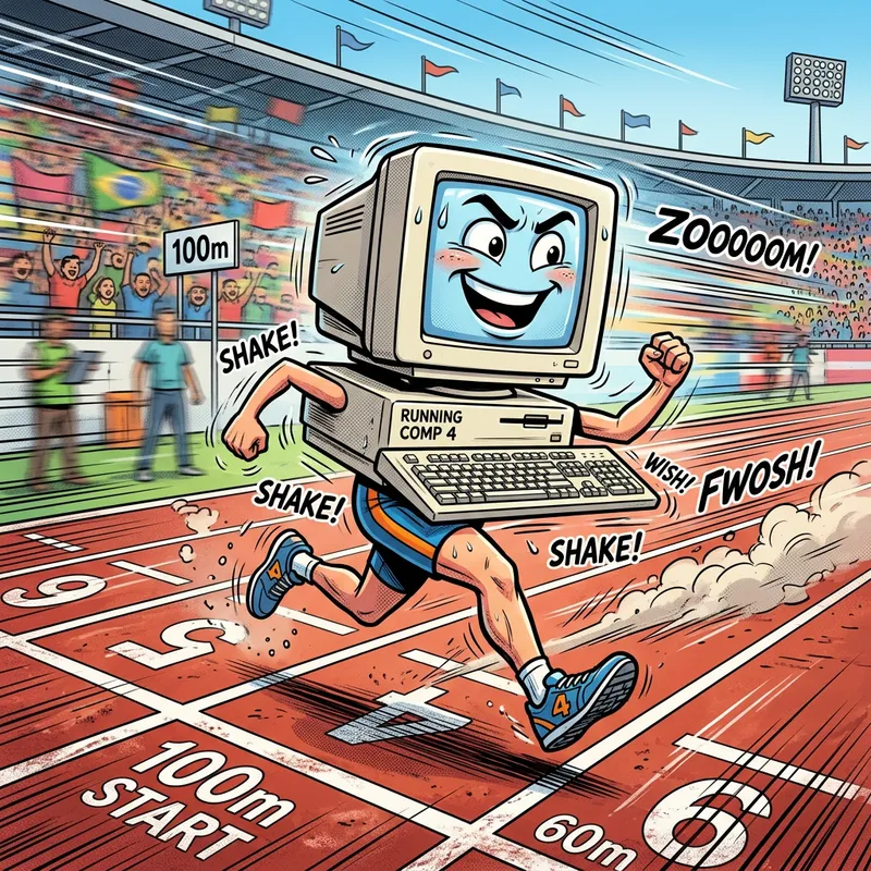 A comic-style depiction of a computer with legs, running a 100-meter dash. The computer maintains an enthusiastic expression as it swiftly dashes through the track, its keyboard and screen visibly shaking due to the intense speed. The background encompasses the details of a standard 100-meter track with white lines marking the distance, crowd in the stands are blurred to emphasize the fast movement of the running computer.