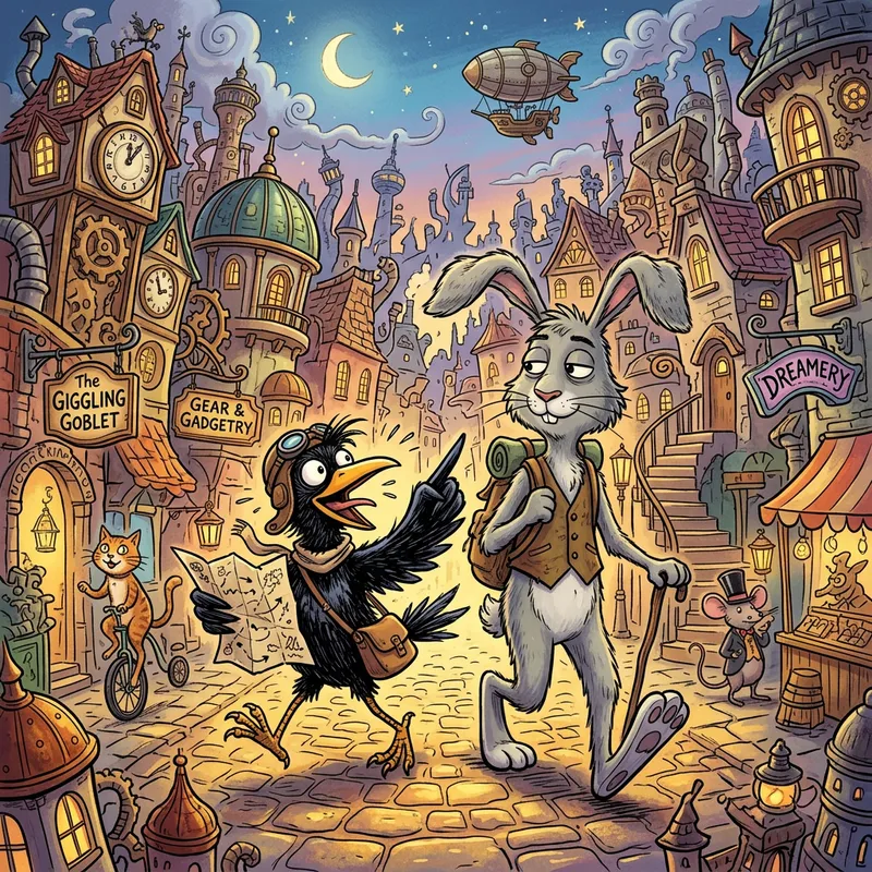 Create an illustration of two comical anthropomorphic characters - one a fast-talking, crazy black-feathered bird and another a grey lagomorph with a laid-back, unruffled demeanor. They are embarking on a mischievous, unpredictable adventure in a surreal cityscape chalked full of unusual and whimsical architecture.